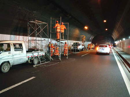 圖為隧道內(nèi)舊燈具拆除現(xiàn)場