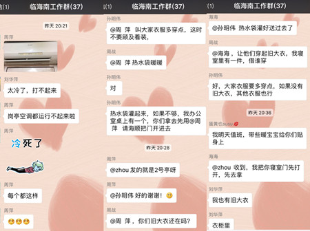 “太冷了,崗亭空調全都運行不起來了。” “每個崗亭都一樣?!?/span> “冷死啦!” “修空調的師傅來了,檢查了一下,他說這個沒辦法,是因為天氣太冷的原因,并不是壞了?!?/span> “大家衣服趕緊多穿點,誰有舊的工作大衣?!?/span> “熱水袋灌起來,不夠,我的拿去先用?!?/span> “我也有舊大衣?!?/span>