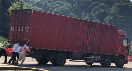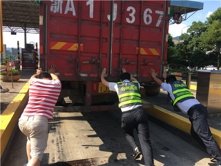 6月19日15時(shí)左右,一輛杭州牌照的大貨車,在進(jìn)入臨海南收費(fèi)所三車道時(shí)突然熄火拋錨,司機(jī)嘗試了幾次無法啟動,立刻下車檢查車況。 “師傅,怎么了?有什么能幫您?”收費(fèi)員徐海源見此情景,立即上前熱心詢問。 “哎!包在油箱口的塑料紙?jiān)趺淳偷暨M(jìn)油箱內(nèi),現(xiàn)在車子怎么都發(fā)不動不了。”司機(jī)有點(diǎn)發(fā)急地回答。 “師傅,別著急,我先找?guī)讉€(gè)同事幫您把車推出車道。”收費(fèi)員趕緊安慰司機(jī)焦急心情。 “好的,那謝謝你們。”司機(jī)連忙點(diǎn)著頭。為了避免車道堵車,徐海源立刻利用對講機(jī)向當(dāng)班班長周萍說明情況,周萍立刻關(guān)閉該車道,啟動備用車道。此時(shí)此刻,收費(fèi)員李俊杰、楊旭佳毫不猶豫的趕了過來與駕駛員一起推動車子。“一、二、三,一、二、三,使勁呀……”可是車子仍然紋絲不動。怎么辦?請求支援!正準(zhǔn)備下班的行政人員陳瑩、劉華萍得知情況后,二話不說飛奔到車道,加入到推車行列中。用力推呀——哎,不行;再來一次——還不行。面對23.97噸的大貨車,大家仍是束手無策。“去找根鐵棒試試!有道是給你一根鐵棒,我能翹起整個(gè)地球。”不知是誰大喊了一聲。“行,可以試試,快去找”話音剛落李俊杰快步跑向所內(nèi),尋找鐵棒。不一會兒,只見他興奮地高舉鐵棒沖著大家喊道:“找到了!找到了!”