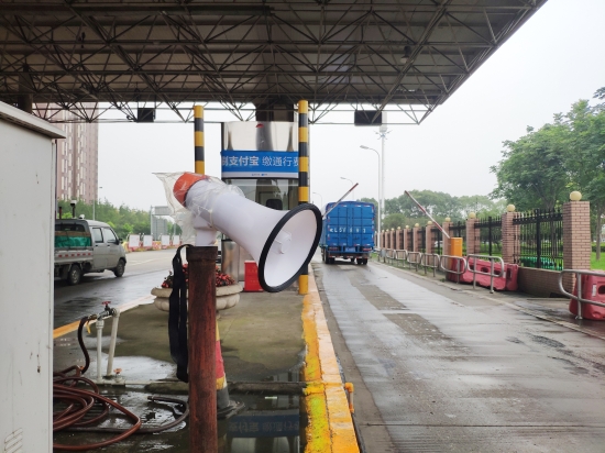 圖為入口處放置的語音警報小喇叭 在嚴把入口關中,該所要求入口必須有人員在崗,履行“一崗雙職”的重任,時刻關注入口情況,及時發現并勸阻違規車輛和人員的進入。此外,入口顯眼處懸掛“請珍愛生命,禁止行人和非機動車上高速”的警示標語。入口處增添放置的管控小助手---語音警報器,循環播放普通話和方言警示標語:“行人、自行車、摩托車禁止上高速公路”。入口安全島頭和邊溝處放置水碼,防止行人、摩托車、電動車和自行車從邊溝處和超寬車道進入高速。而由維養中心人員在入口高處安裝的攝像裝置,只要行人、自行車等非機動車輛出現在攝像范圍內,就會立刻傳來“警戒區域,請盡快離開”的持續性警報聲。在人員的管控和設備的警示下,收費所入口安全不斷地提升。