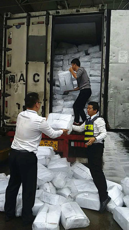 圖為工作人員幫忙搬運掉落的貨物 這輛滿載海鮮的綠農(nóng)車,貨物掉滿車道,司機一人束手無策,當(dāng)班班長陳豐平在拍完綠農(nóng)照片后,叫上班員林葉輝,一起快速幫助司機一件一件地傳遞貨物。盡管每一袋貨物都十分重,但是他們?yōu)榱藥椭鷰煾堤嵩缯碡浳?,顧不得臉上交織的汗水和雨水?/span> 由于工作人員的幫助,司機離開時一直道謝。他們對司乘人員的主動援助,使得溫嶺西收費所的服務(wù)不單單停留在窗口問候上,還將延伸服務(wù)一直呈現(xiàn)。 陳豐平