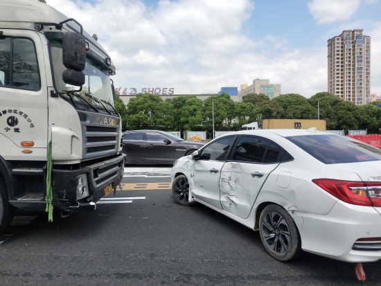 圖為事故現(xiàn)場 聽到巨響,收費(fèi)員立即上前查看,所幸兩車司機(jī)都安好,便立即開啟備用車道,以保證其他車輛通行順暢,并且在事故車輛后方放上小紅帽,告知后方來車及時(shí)駛?cè)肫渌嚨馈6鴥绍囁緳C(jī)快速撥打交警電話,并且拍照留證,以最快的速度駛出收費(fèi)站靠邊等待交警處理。 經(jīng)調(diào)取錄像,查看事故緣由。“真相”竟是集裝箱司機(jī)引發(fā)的,該車從杭州寧波方向過來,小轎車司機(jī)從溫州方向匝道駛出,由于集裝箱司機(jī)下橋時(shí)沒有注意右方來車,只顧自己右拐車道,直接頂著轎車開出50多米,所幸未造成人員傷亡。 在此小編提醒大家:在駛?cè)朐训赖臅r(shí)候,司機(jī)要減速行駛;在選擇出口車道的時(shí)候,要仔細(xì)查看前后方和左右來車,且不要突然變更車道,否則容易造成車輛之間的親密“接觸”。 只有文明安全行駛,才是對自己和他人最好的保護(hù)。 鄭霞霞