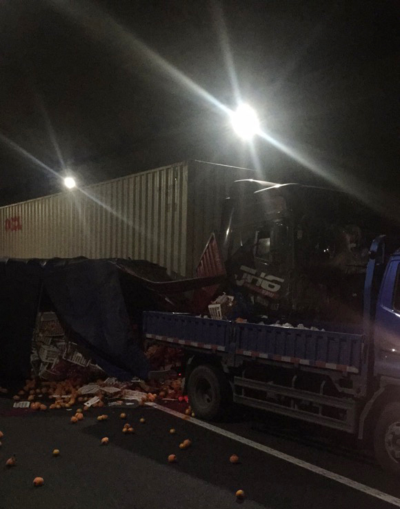 圖為事故現(xiàn)場 得知此情況,所負責人第一時間趕赴事故現(xiàn)場。事故就是命令!救援隊伍立即兵分三組,一組由駕駛員林通用巡邏車送傷者至臺州收費所出口,與前來救援的120救護車進行對接,一組由金志輝、宋勤滿在寧向南洞口卡口,一組由李海福所長、應錦清副所長在現(xiàn)場協(xié)調指揮,同時配合交警維護通行秩序,與交警一起對事故現(xiàn)場展開救援。 經了解,由于藍色貨車超車道緩慢行駛,集裝箱與貨車發(fā)生車輛剮蹭追尾導致后方送桔貨車側翻。貨車上的桔子多半散落,給清障帶來一定的難度,管理所負責人、高速交警、清障人員、養(yǎng)護人員共同當起了“指揮員”、“搬運工”,全力清理事故現(xiàn)場。 16時36分,由于處理及時,措施得當,事故未造成大面積擁堵,道路恢復正常通行。 林玲