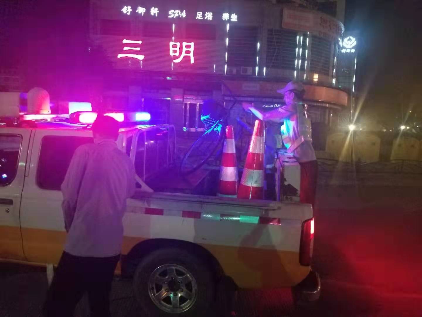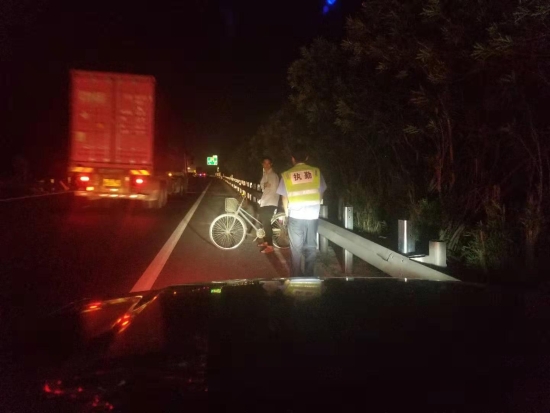 圖為執勤隊發現騎車人 9月24日21:09分,大溪嶺隧道所中控室發出通知。執勤隊員接中控指令,迅速出警。晚上九點,在高速公路上找人,需得打上12分的精神,巡邏車放慢車速,坐于后座的隊員們緊盯著車道兩旁,終于在21:14分,距離寧向隧道出口一公里處發現該騎車男子,隊員們立即上前將其攔住。眼前的一幕令執勤隊員嚇出一身冷汗,該男子左手殘疾,單手騎車,晚上視線模糊,且高速公路上車多,速度快,司機很難發現有行人,如發現躥出來的行人而采取緊急制動,會造成多起追尾事故,現場情況非常危險!隊員們合力將自行車抬上車。