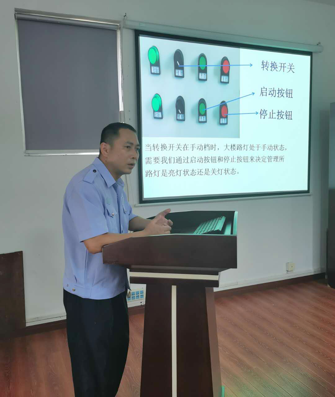 圖為電工業(yè)務(wù)培訓(xùn)現(xiàn)場(chǎng) 湯寧光在電工崗位已經(jīng)19載,有著豐富的工作經(jīng)驗(yàn)。他用聊家常的方式來講解線路控制的工作原理圖、電路的故障排除方法、光控開關(guān)的接線方法,PPT課件中配有隧道所配電房中相應(yīng)的照片和線路圖,并注解,簡(jiǎn)潔明了,通俗易懂。在授課過程中,他每講到一處結(jié)尾,便與聽課人員互動(dòng),現(xiàn)場(chǎng)為大家答疑解惑,課堂氛圍熱烈,互動(dòng)感很強(qiáng)。
