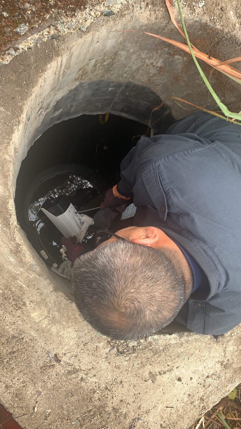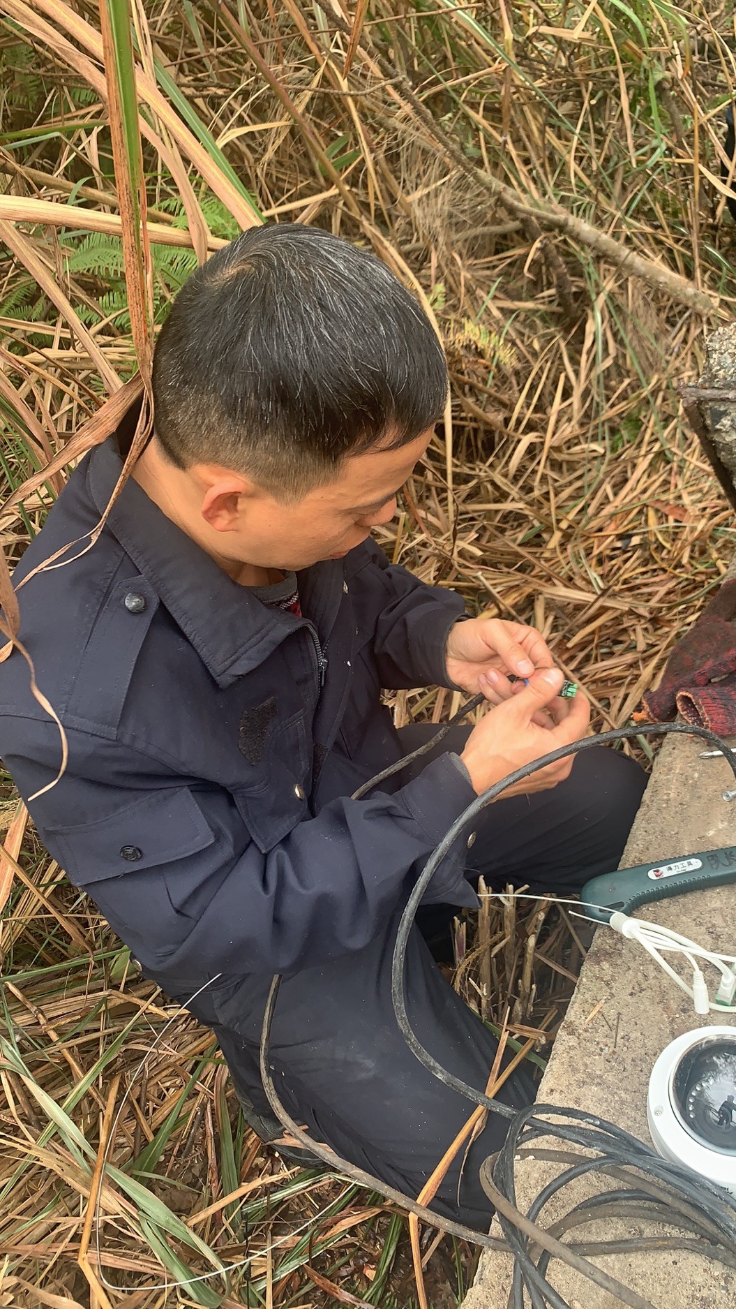 大溪嶺南高位水池地點(diǎn)在溫州地界,山體較高,攀行需要近一個(gè)小時(shí),金所得知情況后,立即帶著執(zhí)勤隊(duì)上山到高位水池檢查,他們背著工具箱,戴著手套、拿著柴刀,經(jīng)過(guò)一個(gè)小時(shí)的披荊斬棘來(lái)到南高位水池的井口,金所爬到井里進(jìn)行檢查,發(fā)現(xiàn)光纜和電線都被老鼠咬斷了,才導(dǎo)致圖像不能工作,當(dāng)場(chǎng)把電線接了回去,并回所準(zhǔn)備其他材料,明日再次登山修理。