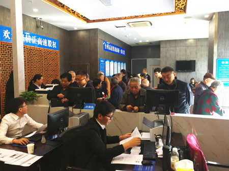 10月31日當天,全市各收購點股東絡繹不絕,股東轉讓熱情高漲,場面尤其火爆。當天下午,收購時間點過后,還有股東在收購點辦理轉讓手續。 李佩紅