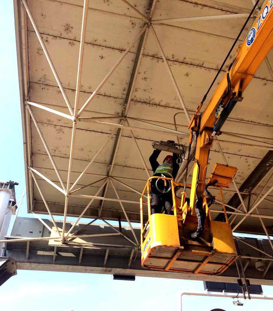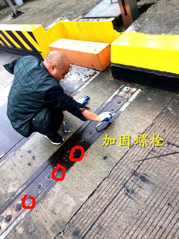 圖為隊員正在更換車道頂棚燈 期間在臺州南收費所發(fā)現(xiàn)有兩個車道出現(xiàn)異常,即當重型車輛通過時,輪檢鐵板和稱臺出現(xiàn)不正常晃動情況。根據以往經驗,此情況如不進行及時維修,對車輛計重將造成嚴重影響。對此,技術人員不僅對鐵板上每顆螺栓都進行了認真細致的重新加固,之后不厭其煩對每個稱臺限位都進行了多次調整,直至將晃動幅度控制在正常范圍內。
