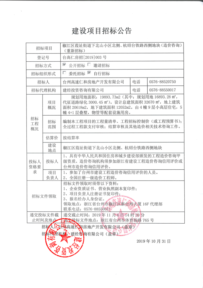 椒江區(qū)葭沚街道下北山小區(qū)北側、杭紹臺鐵路西側地塊(造價咨詢)招標