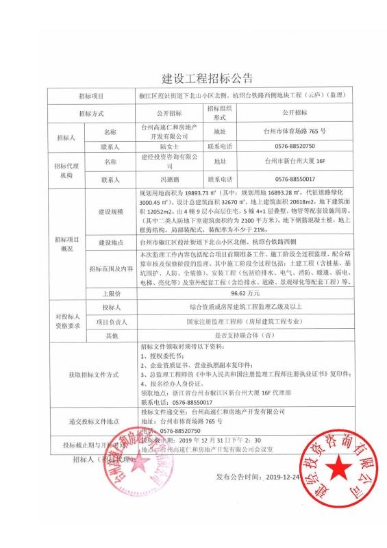 椒江區葭沚街道下北山小區北側、杭紹臺鐵路西側地塊工程(云廬)招標公告
