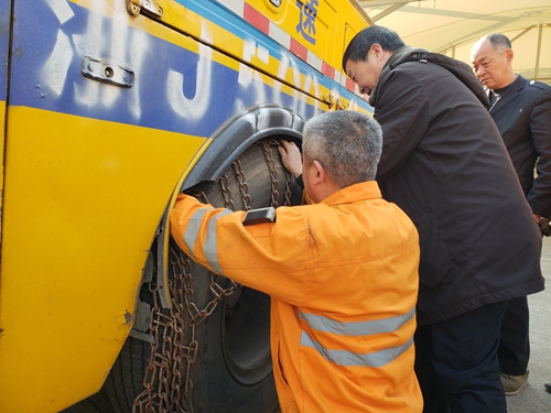 圖為捆綁好的防滑鏈 輪胎捆綁防滑鏈是車輛行駛在冰天雪地中增加輪胎對路面的摩擦力,以防止打滑的一項安全措施。雖然在南方這樣的氣候很少見,在實際工作中也較少遇到,但是施救中心每年都會開展相關的操作演練,并且要求全體員工務必熟練操作,此是安全預防的重要工作之一。