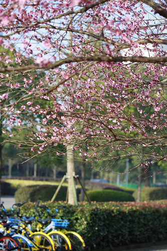 最后一站,便是市民廣場(chǎng),我見(jiàn)過(guò)的最美公交站臺(tái)。初春的清晨啊,一下車便有沁香拂散,迎接我下車的那是大片繁花盛開呀,路邊草地一溜的紅梅、白梅,在藍(lán)天下絢爛地肆無(wú)忌憚地綻放。呵,是的,還有藍(lán)天,最近流行的一個(gè)詞叫“臺(tái)州藍(lán)”,忽然想起來(lái),每日公交車上下班,低碳出行,這算是我為“臺(tái)州藍(lán)”添了一筆淡藍(lán)嗎?應(yīng)該是吧。于是,在藍(lán)天紅白花海中,慢慢穿過(guò)梅林、小橋、亭子,上班之路竟是如此心情舒緩。 鄭蔚