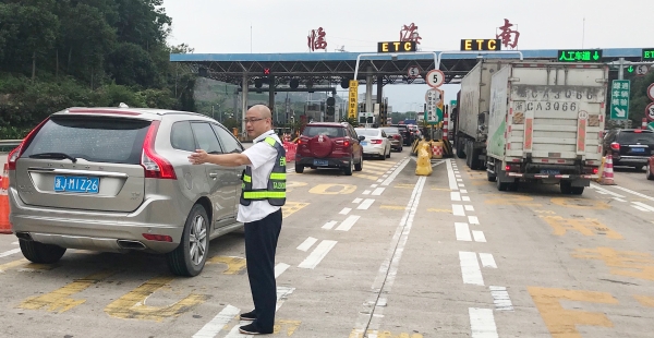節(jié)日期間,車流量比往日多很多,每天多次出現(xiàn)長(zhǎng)時(shí)間大分流,一遇上高峰期車輛源源不斷地從各個(gè)方向匯聚在此,容易造成內(nèi)外廣場(chǎng)堵車。臨海南收費(fèi)所車輛雖多,但該站所出口秩序井然,未出現(xiàn)擁堵現(xiàn)象。瞧!這位在車流中,身著反光背心在這場(chǎng)大車流中,揮舞著雙臂指揮著交通,讓飛馳的車輛通過客貨分離,有效降低客貨車隨意串道,達(dá)到快速放行的是四班班長(zhǎng)楊俊輝。